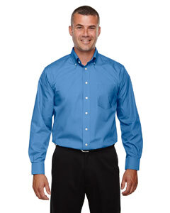 3.5 oz./ydý / 115 gsm, 55% cotton, 45% polyester broadcloth; fine yarn count shirting; true Non-iron performance straight from the dryer; stain release finish; Classic Fit for professional appearance; pearlized buttons; patented pucker-free taped seams; specially fused collar, cuffs and placket; bias cut back yoke; straight collar; left-chest pocket;
