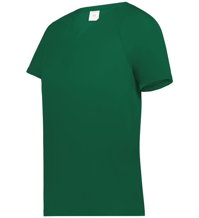 100% polyester wicking knit with color secure(r) technology that helps prevent dye migration * Wicks Moisture * Ladies' fit * Updated fit has longer length and bigger chest for added comfort * V-neck collar * Raglan sleeves