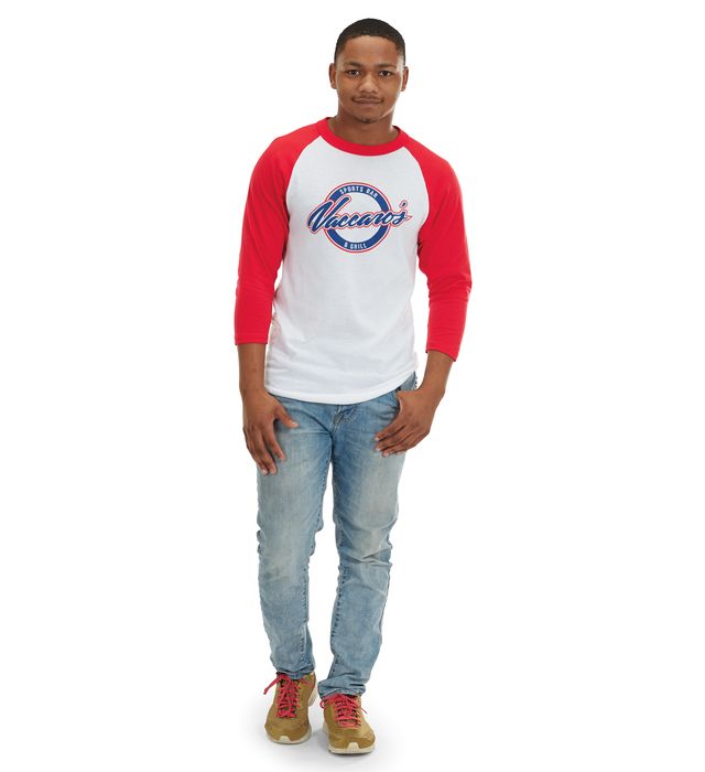 4.8 ounce 50% polyester/50% cotton jersey knit * Tear away label * Crew neck * 3/4" length raglan sleeves * Serged fishtail bottom