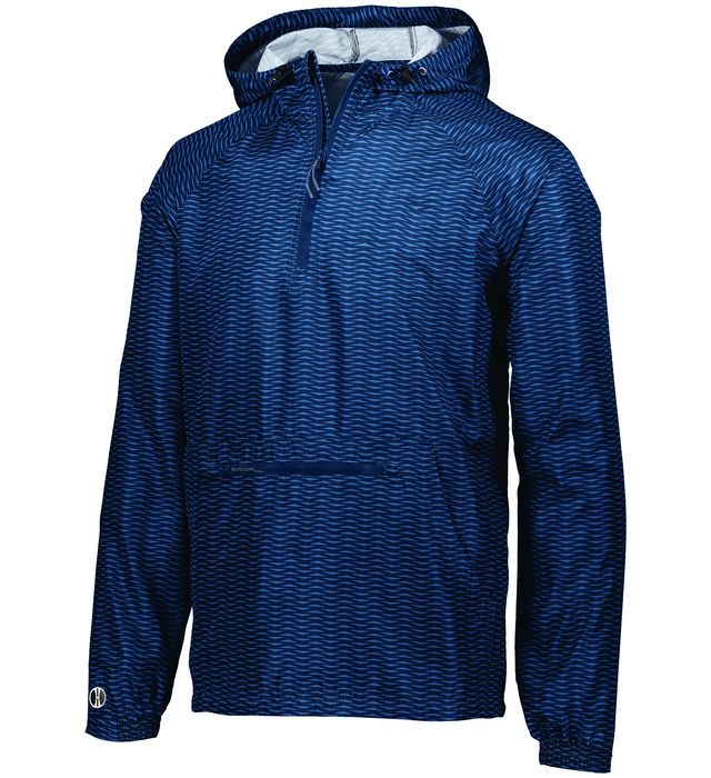 Tech weave printed Micron(tm) lightweight polyester, wind/water resistant fabric * Quarter zip pullover style * Adjustable 3 piece hood with eyelets and concealed cord locks on Adult sizes only (elastic on youth) * Raglan sleeves for maximum mobility * Jacket folds up into zippered front pocket * Half-elastic cuffs * Adjustable bottom hem with hidden shockcord closure in right pocket on Adult sizes only * Water-resistant