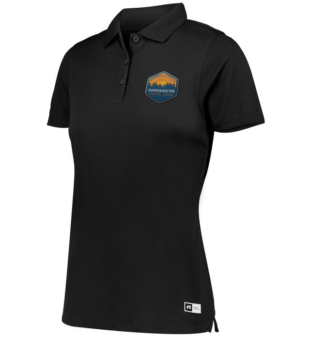 4.0 ounce 100% polyester * Dri-Power(r) Moisture Wicking Technology * Odor protection * Ladies' fit * Tag-free label * RUSSELL ATHLETIC heat sealed label on bottom left front * Ribbed collar * Three-button placket * UPF 30+, provides protection from the sun * Set-in sleeves