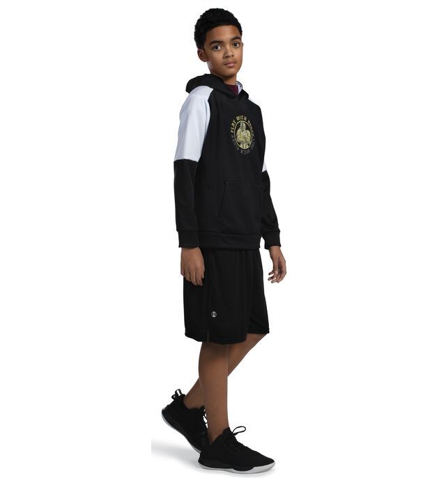* Dry-Excel(tm) 5.9 ounce 100% polyester performance wicking fleece with color secure(r) technology that helps prevent dye migration * Wicks moisture * Tag-free label * 3 piece hood with lightweight mesh lining * Set-in sleeves * Front pouch pocket * Self-fabric cuffs and bottom band * Open bottom