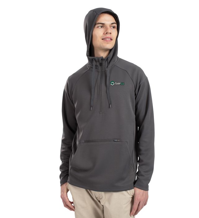 * Dry-Excel(tm) 100% polyester wicking double knit mesh texture * Wicks moisture * Woven label * High collar, half-zip pullover style with zipper garage and collar * Pinhole mesh lined hood with drawcord * Raglan sleeves for maximum mobility * Front zippered valuables pocket * Front pouch pocket * Half-elastic cuffs * Dropped tail