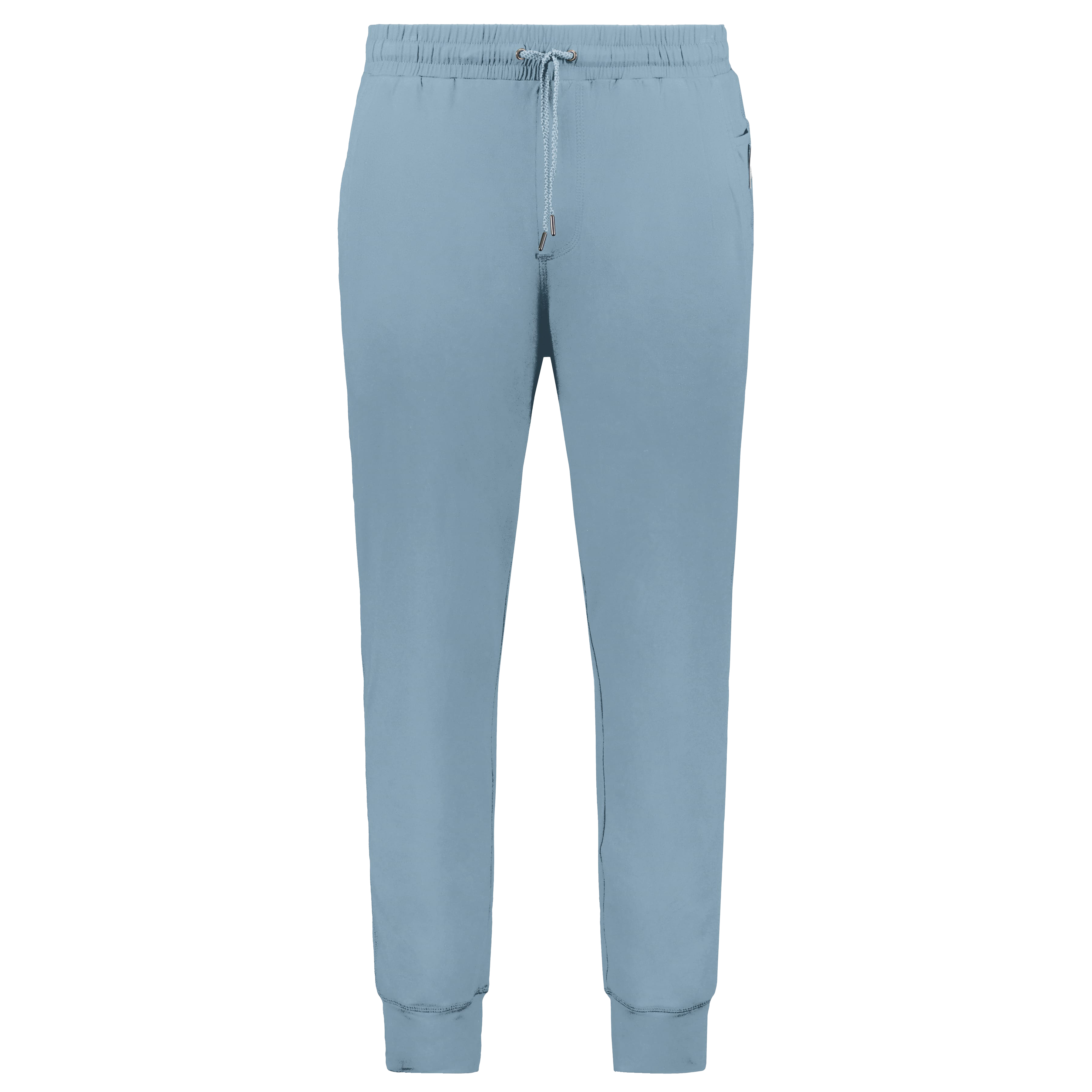 * Lightweight, soft-knit * Solids, 89% recycled polyester/11% spandex * Heathers, 45% recycled polyester/44% polyester/11% spandex * Wicks moisture * Tag-free label * Covered elastic waistband with outside drawcord * Faux fly * Front pockets with inner valuables pocket inside left pocket * Back pocket with zipper * Tapered leg