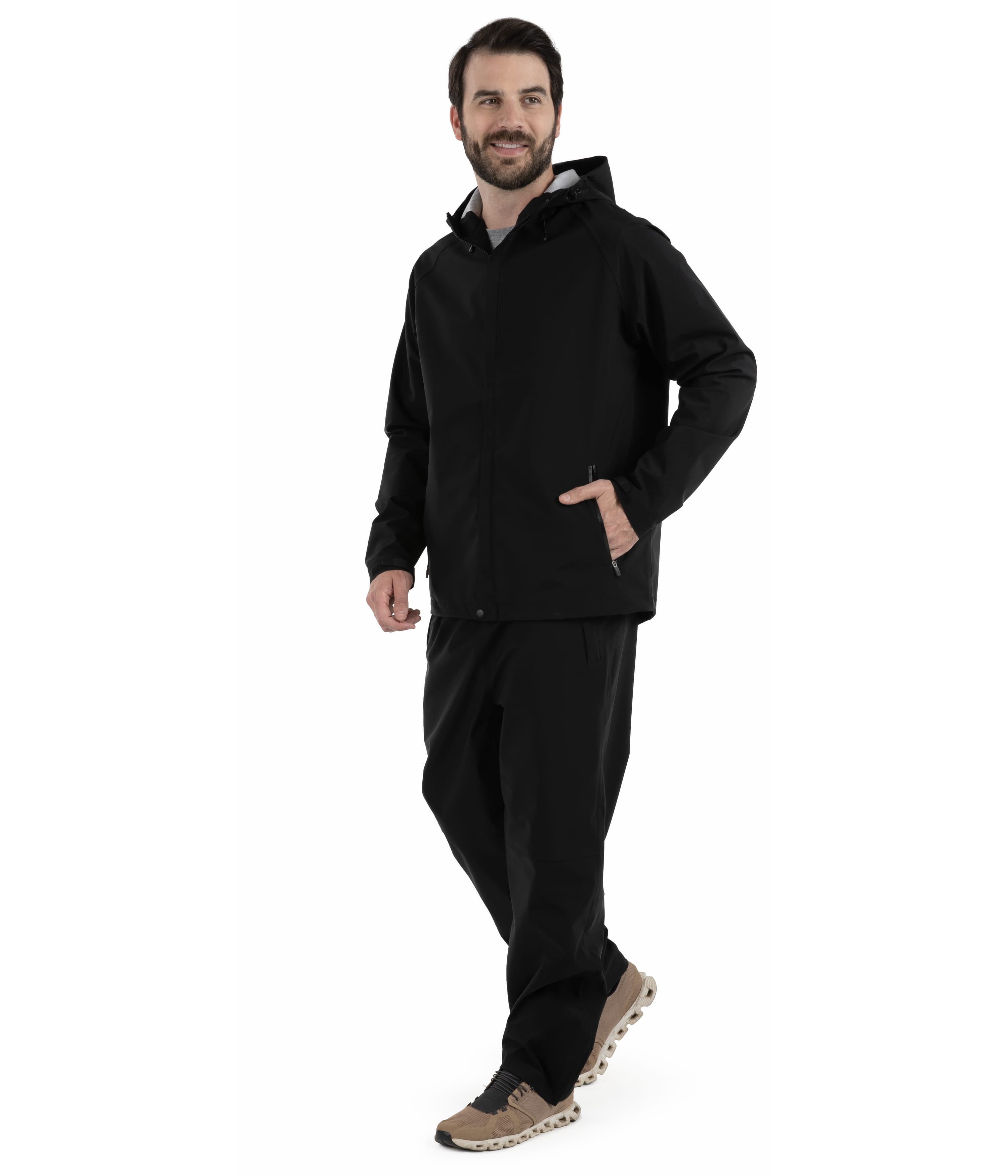* 100% polyester with DWR and PU coating * Shell fabric features 9,000MM fabric waterproof rating 2,000G/M2 fabric breathability rating * Stain Resistant * Heat sealed label *Elastic waistband with inside adjustable shockcord closure * Front openings for pocket accessibility * Back zippered pocket with zipper garage * Designed to wear over regular pants * Sealed seams for protection from rain * Zipper on outside lower leg